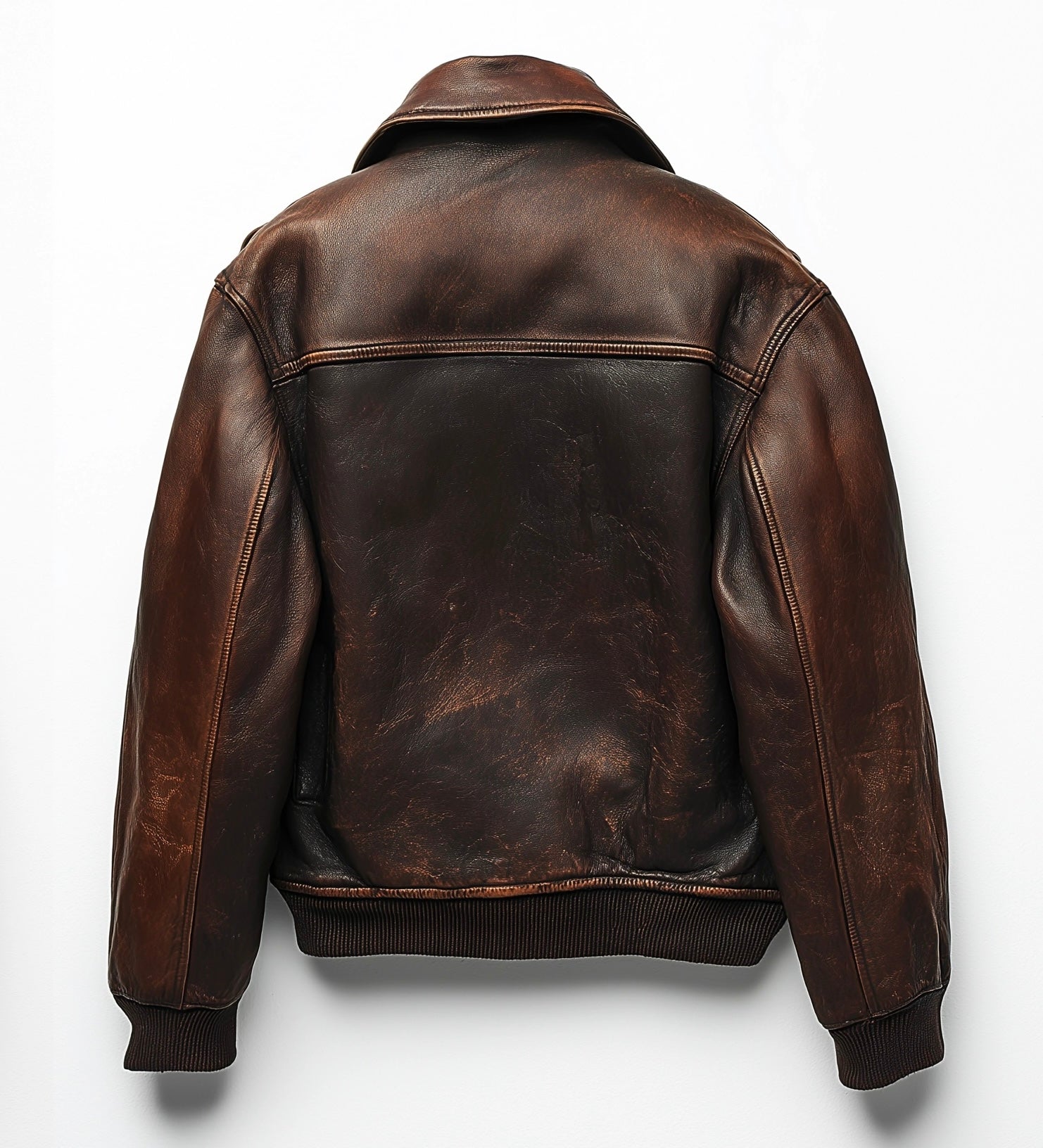 A rugged, leather Jacket, its rich, Dark brown leather patinas with years of wear and tear. This iconic piece exudes a sense of history and adventure, ready to be worn on your next journey.